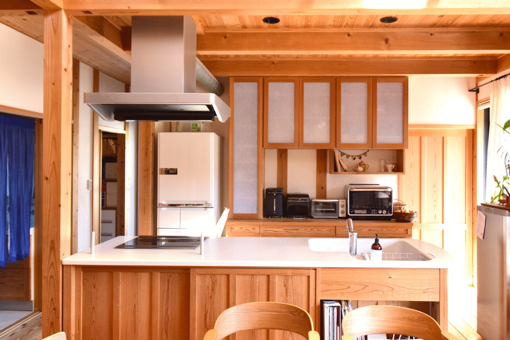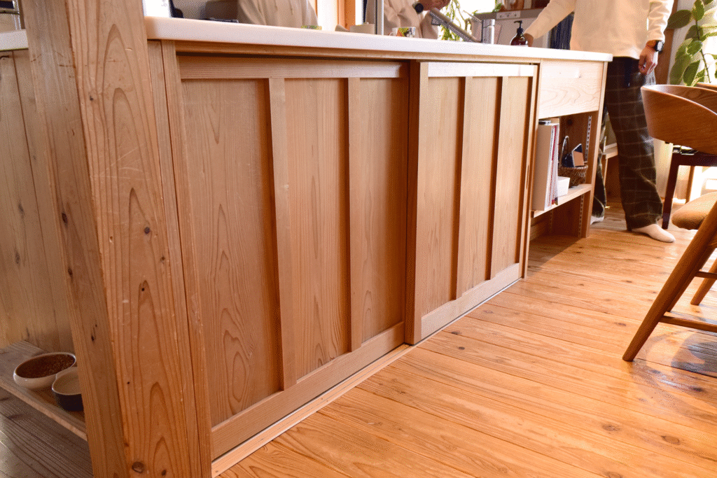 その願いをかなえるべく、システムキッチンをカスタムメイドして、K様邸だけの特別な木のキッチンが生まれました。