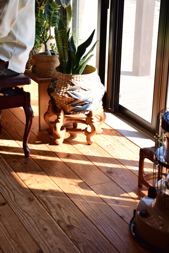 無垢・無塗装の音響熟成木材の「うづくり」フローリングは、ツヤが出ていいかんじ。