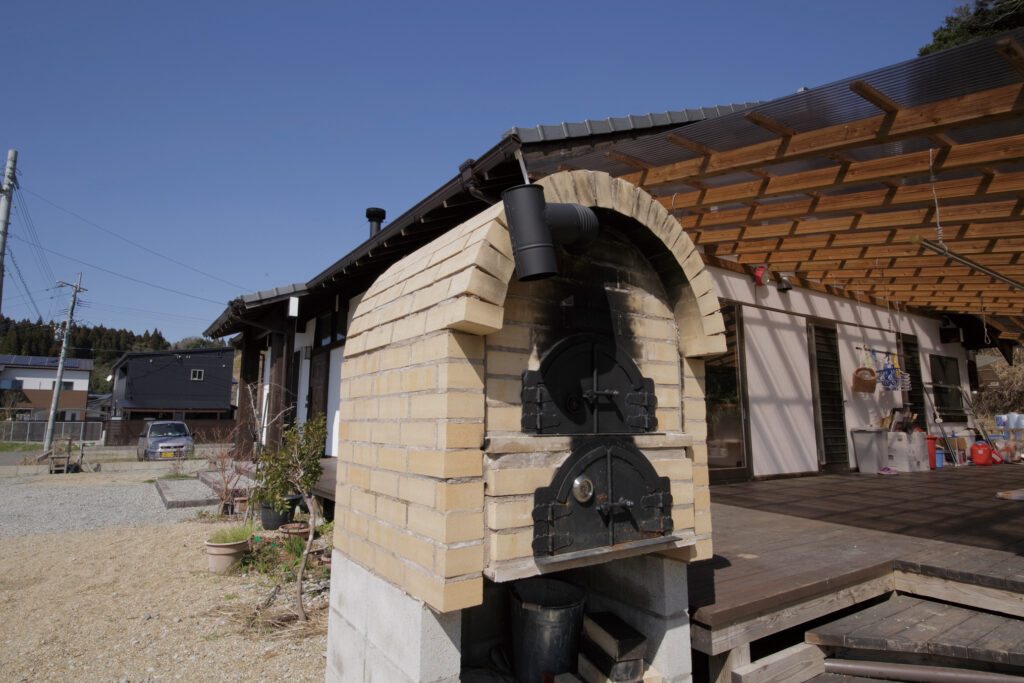 ウッドデッキ付きの広々とした平屋建てで、薪ストーブや自家製のピザ窯もあります。