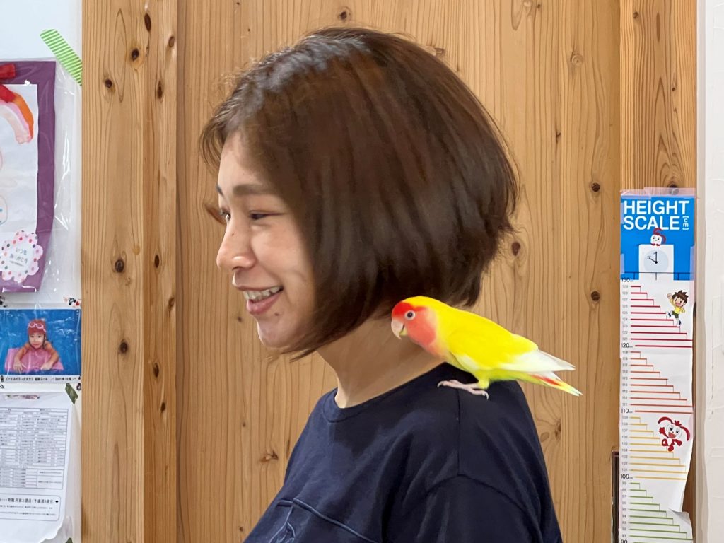 ぴーちゃんはいつも肩に乗ってくるそうです。