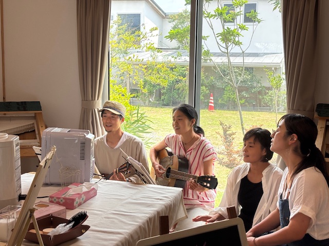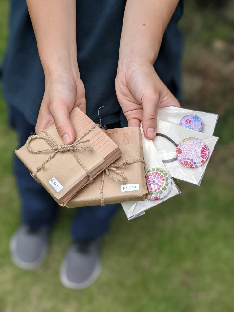 ◉月のひかり(就労支援継続B型作業所):音響熟成木材の端材を利用者さんが一生懸命磨いたコースター作品に加え、エプロンやシュシュ、苗など販売