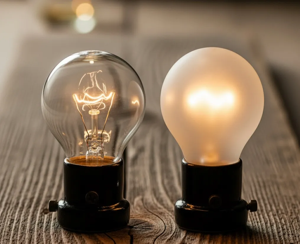 明治時代の頃から白熱電球と呼ばれるものが次第に使われるようになりましたが、透明なガラスに覆われた電球だと、光が広がりすぎたり眩しく感じられたりすることもあったため、それらを抑えるために、後に乳白色のガラスが使われるようになりました。