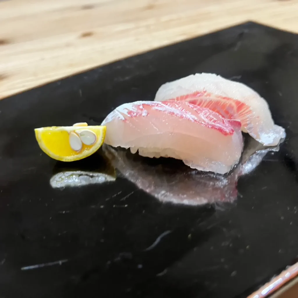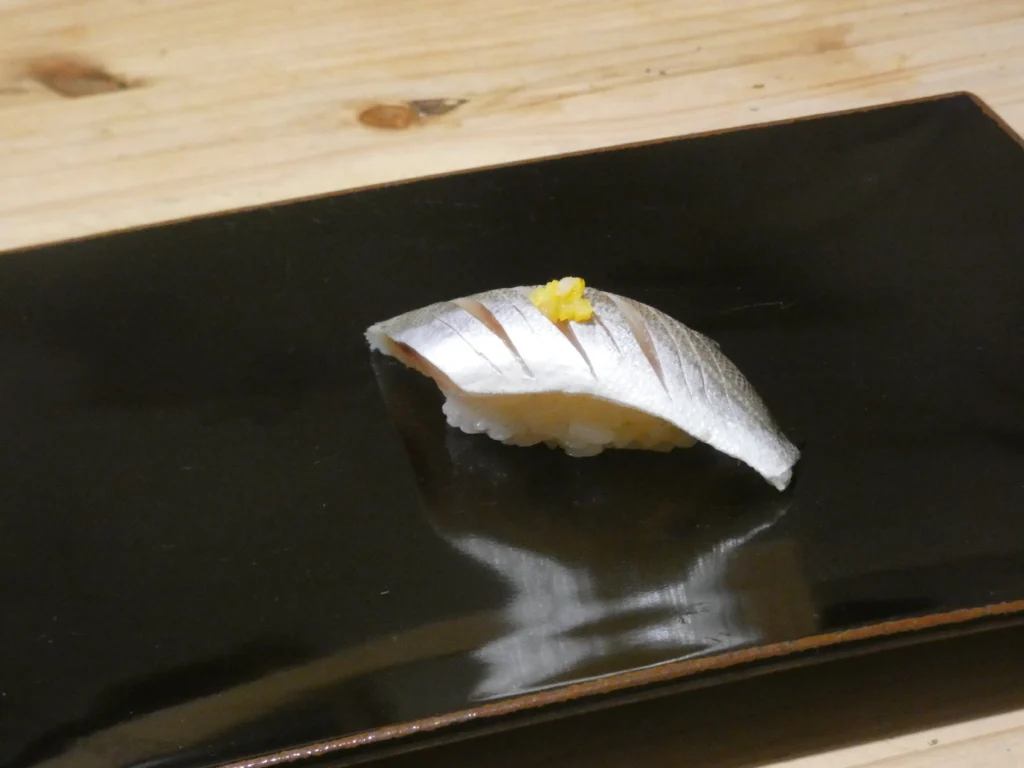 柚子果汁と酢で〆て飾り包丁を入れて握った、美しく美味しいカマス