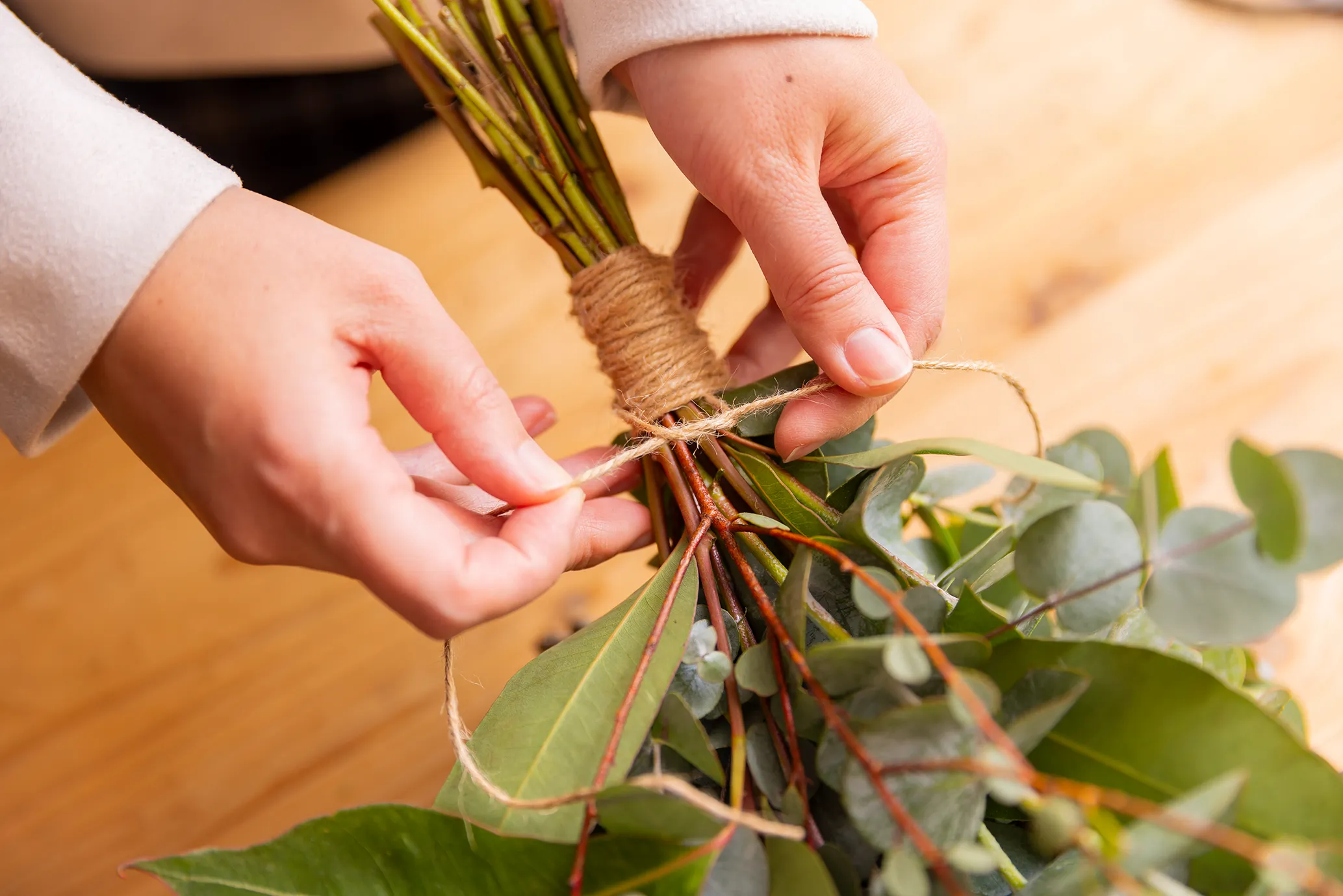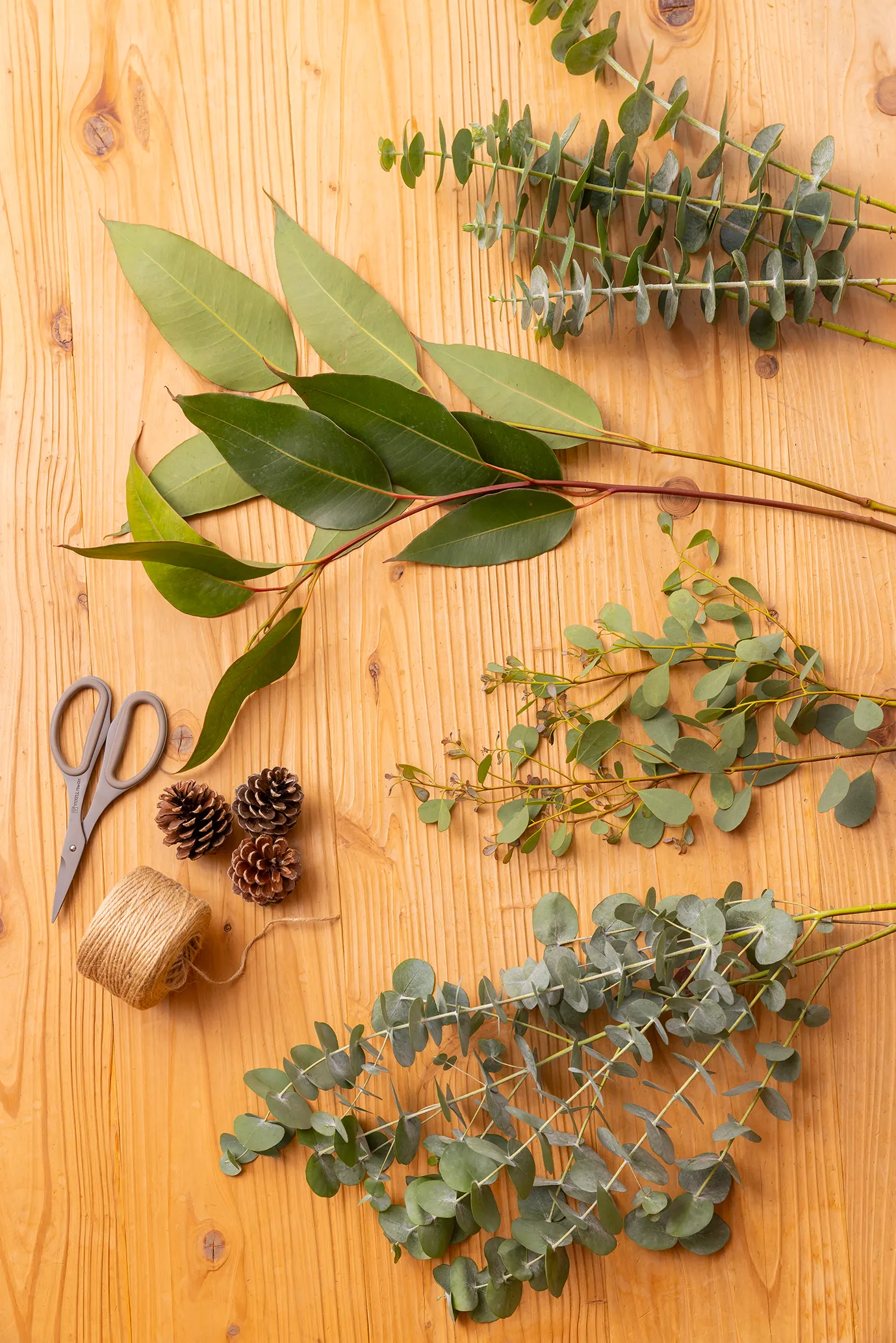 松ぼっくりに巻いた麻紐が隠れるようにユーカリを重ねると、綺麗に仕上がります。