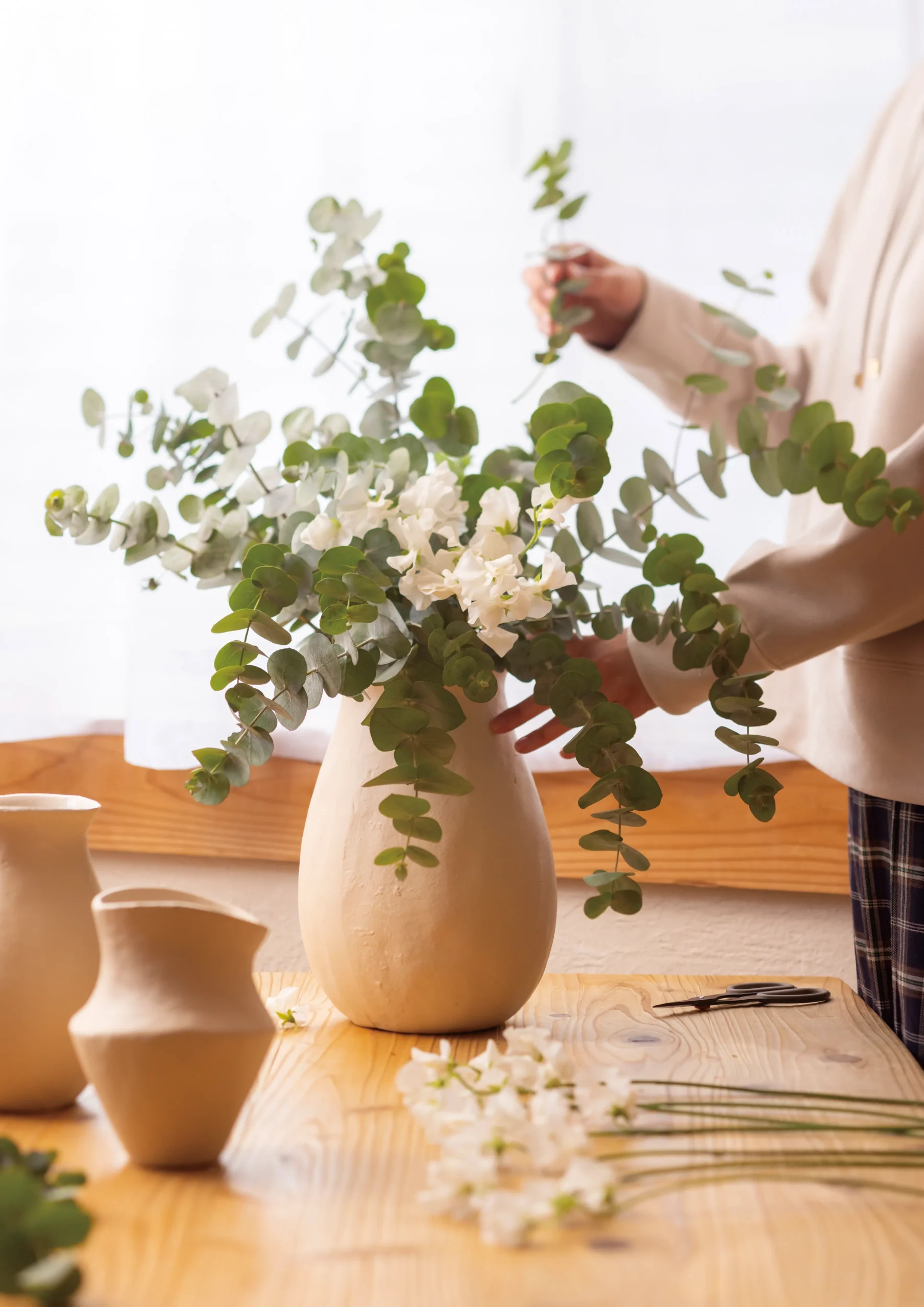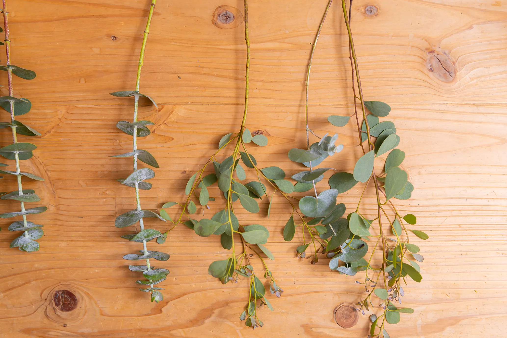 いろいろな種類のユーカリを組み合わせて素敵にアレンジしたら、飾ってそのままドライフラワーに。