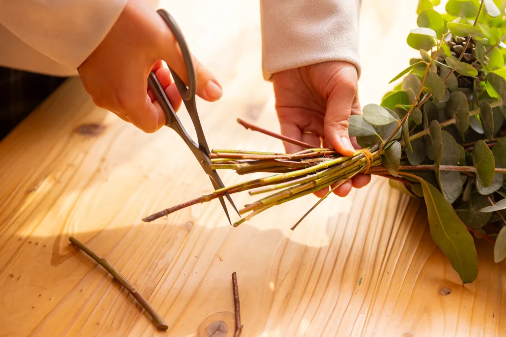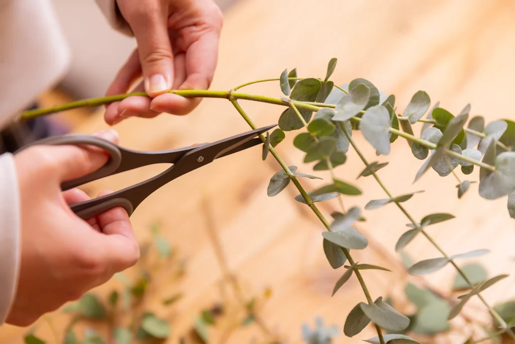 ユーカリを仕上げたいサイズに合わせて切り分け、下葉を取ります。