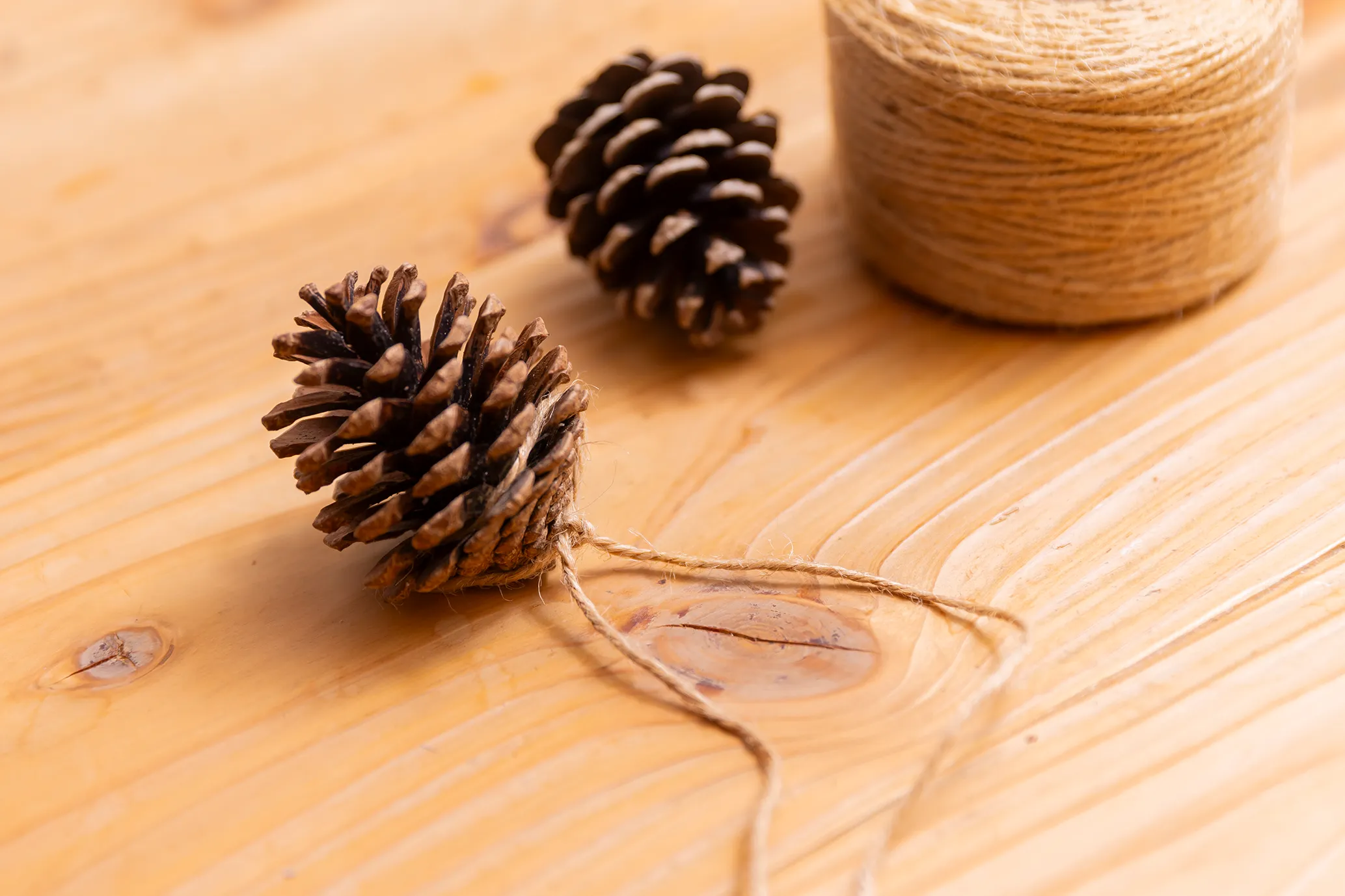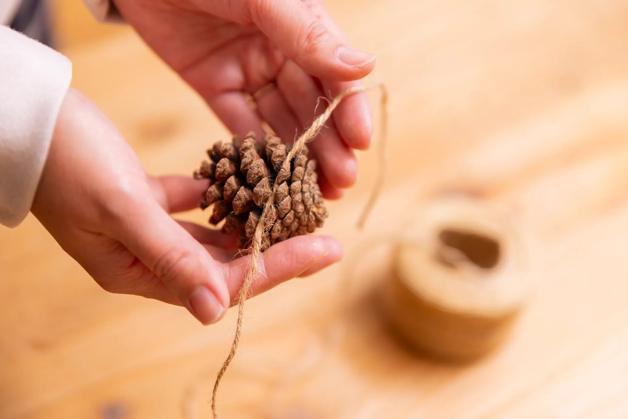 松ぼっくりの笠の下の方に麻紐を巻き付け、固結びします。