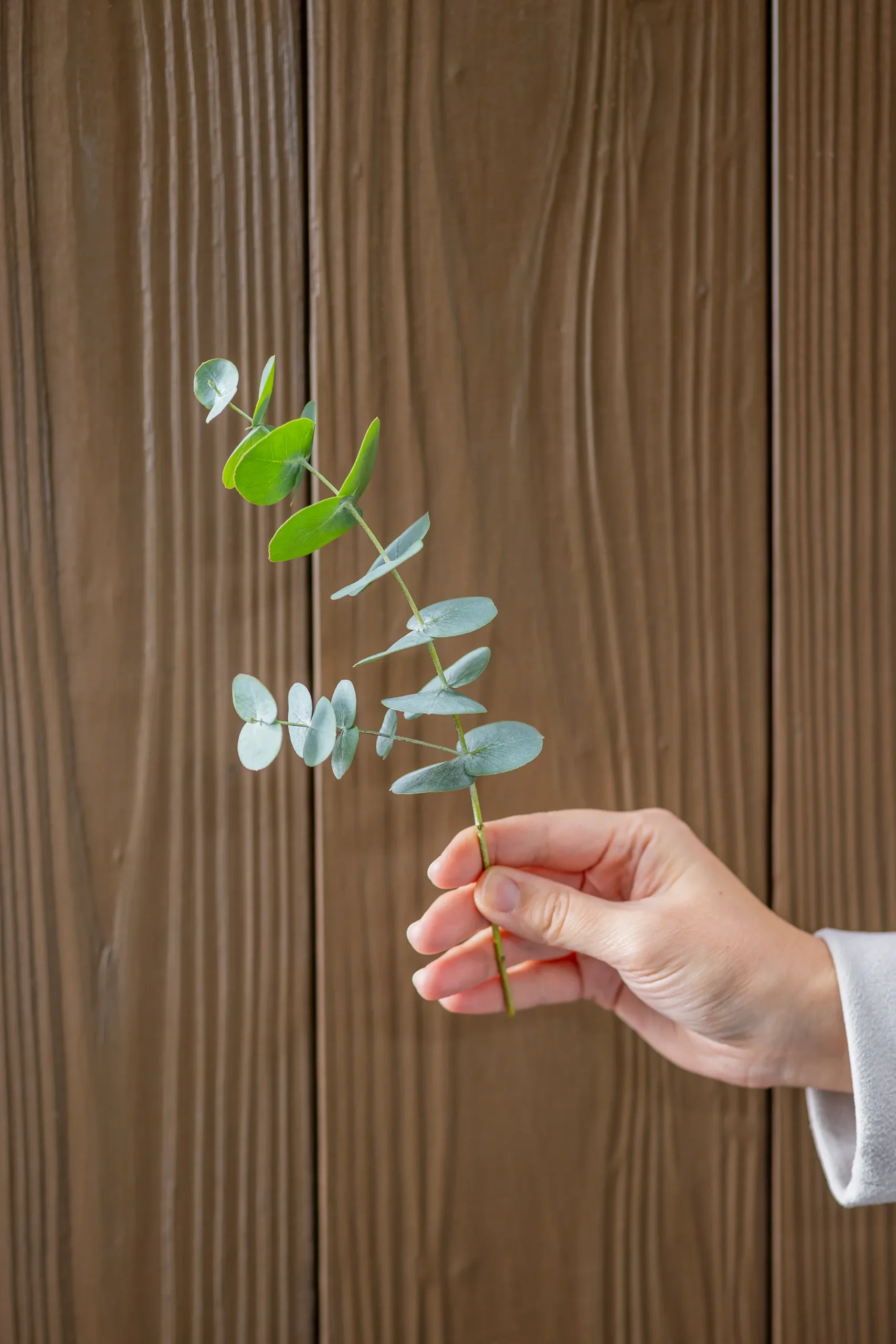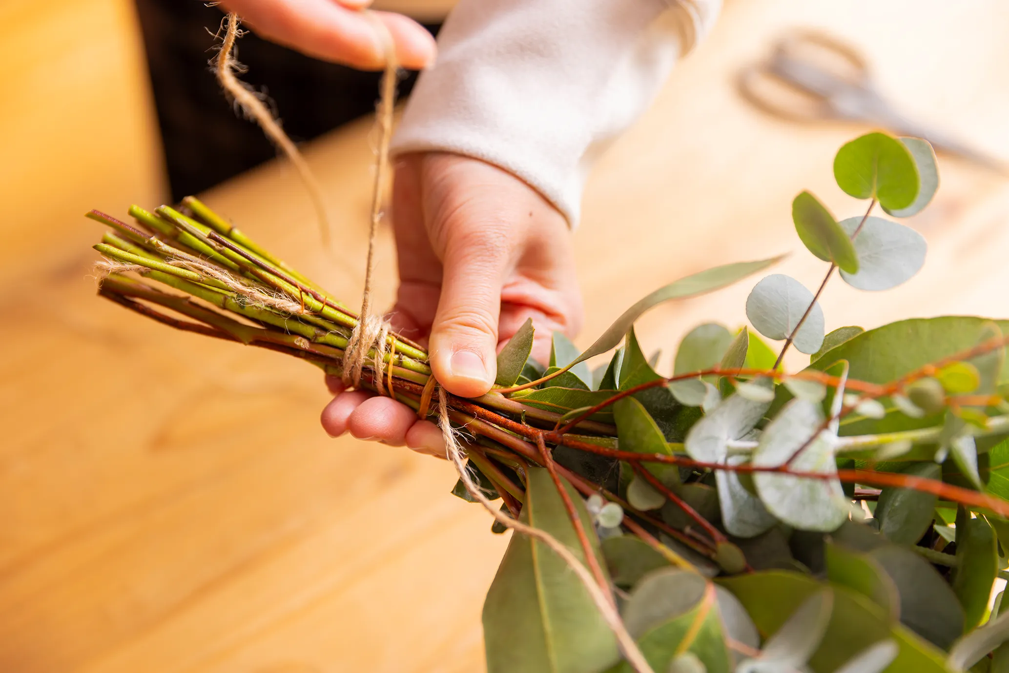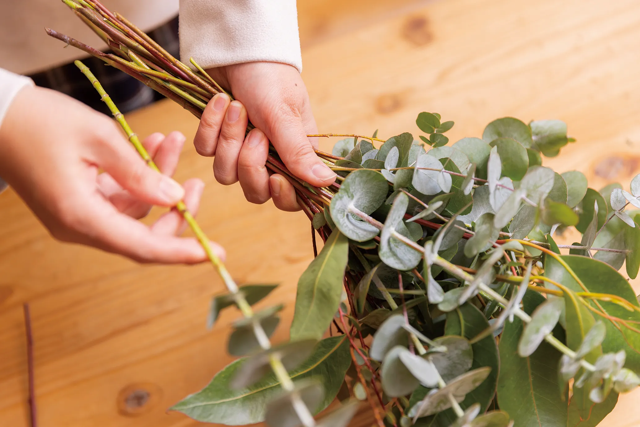 2月頃に種類がいちばん豊富になるユーカリは、花束などのフラワーアレンジメントをはじめ、そのまま花瓶に生けたり、束ねて壁に吊るすスワッグやリースの素材に使ってみたりと何にでも合わせやすく、思い思いでいろいろな楽しみ方ができますが、今回は、形が違うユーカリをいくつか使って、スワッグを楽しんでみます。