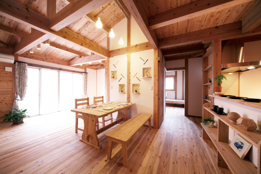 家具や建具、収納スペースなどもすべて音響熟成木材と幻の漆喰を使い、ご両親もご満足の1階リビング・ダイニング