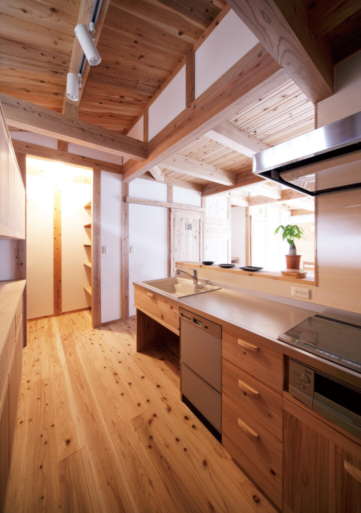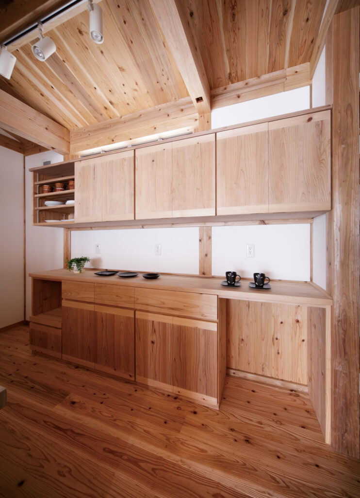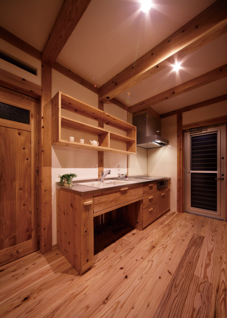 2階と同じく音響熟成木材の手づくりキッチンです