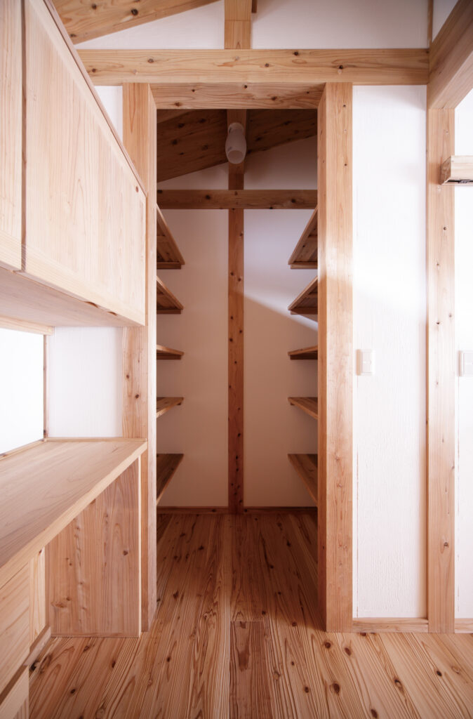 音響熟成木材と幻の漆喰のパントリーで食品保管も安心