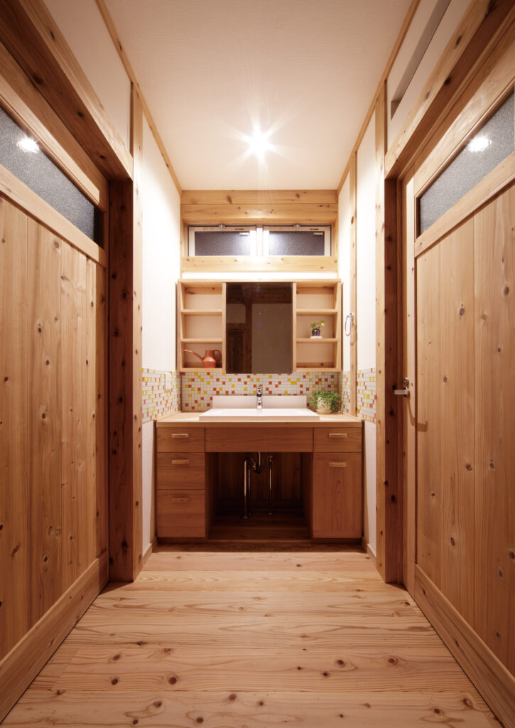 オリジナルの洗面台と色鮮やかなタイルで素敵に