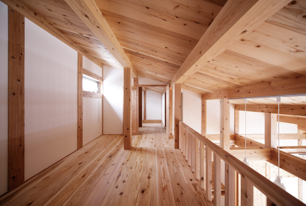 構造材にも音響熟成木材を使った、開放的で木の香りに満ちた心地いい住空間が魅力の2世帯住宅です。1階がT様ご両親の生活スペース、2階がT様ご家族4人の生活スペースとなっています。