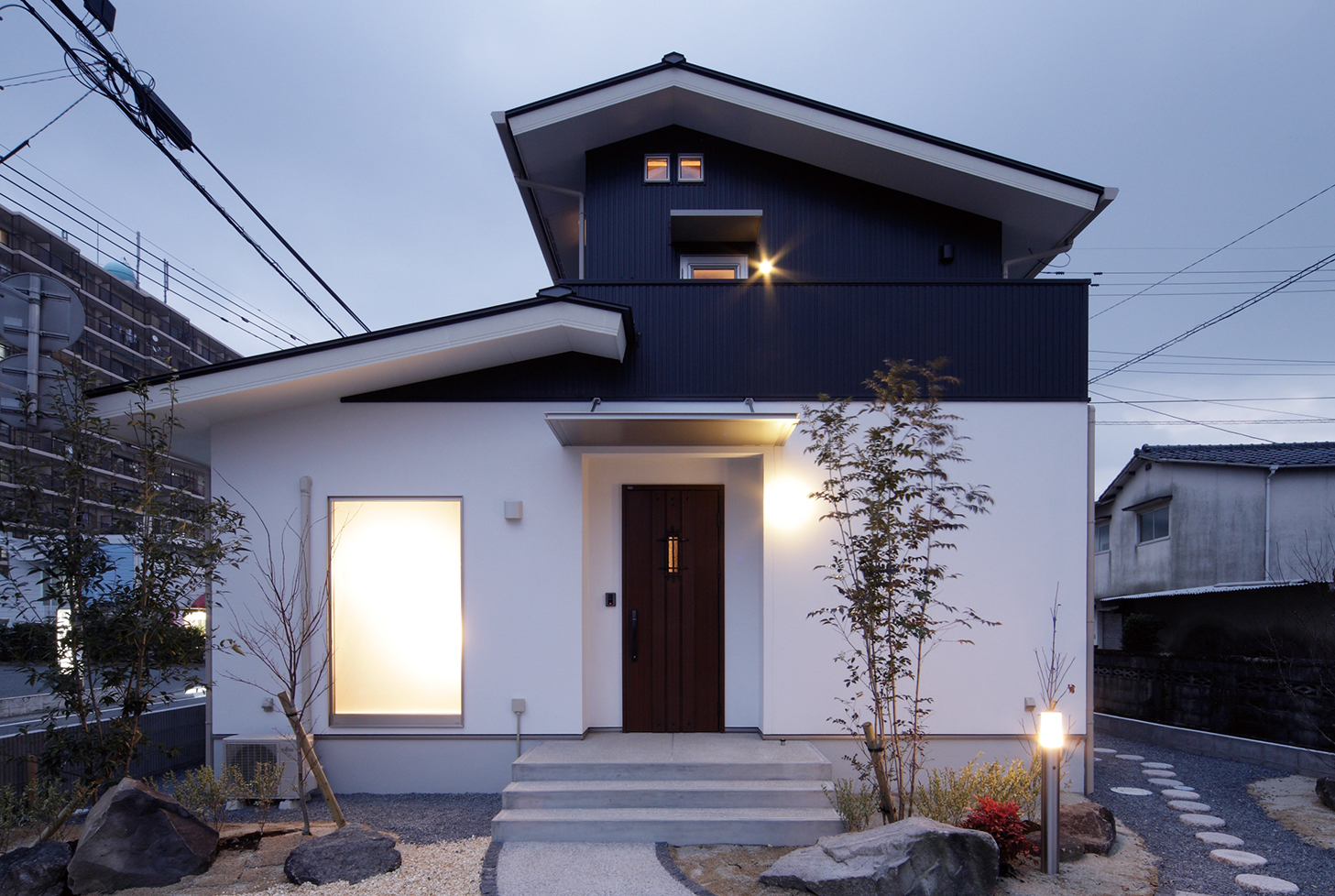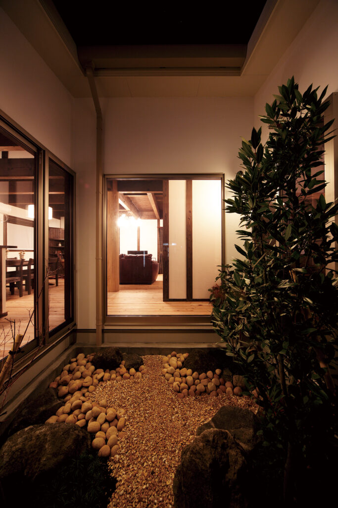 優しい灯りがこぼれる中庭からみたリビング・ダイニング