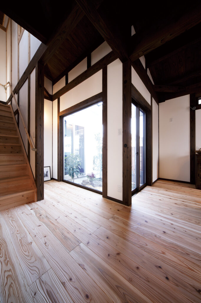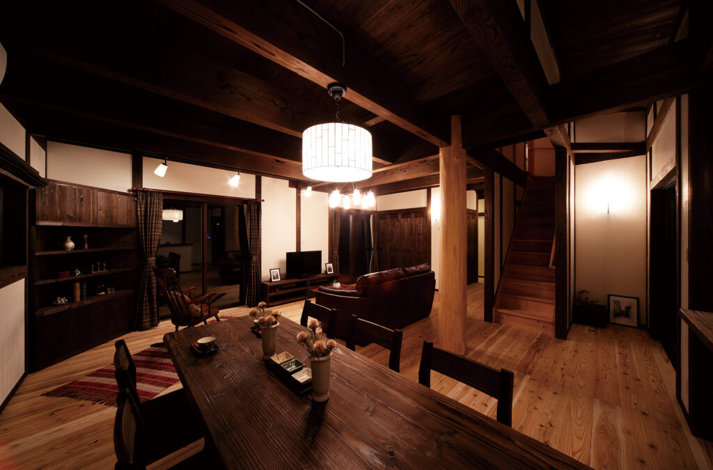 音響熟成木材「赤」の床材と「黒」の構造材と家具・建具が絶妙な調和をみせる洒脱なリビング・ダイニング