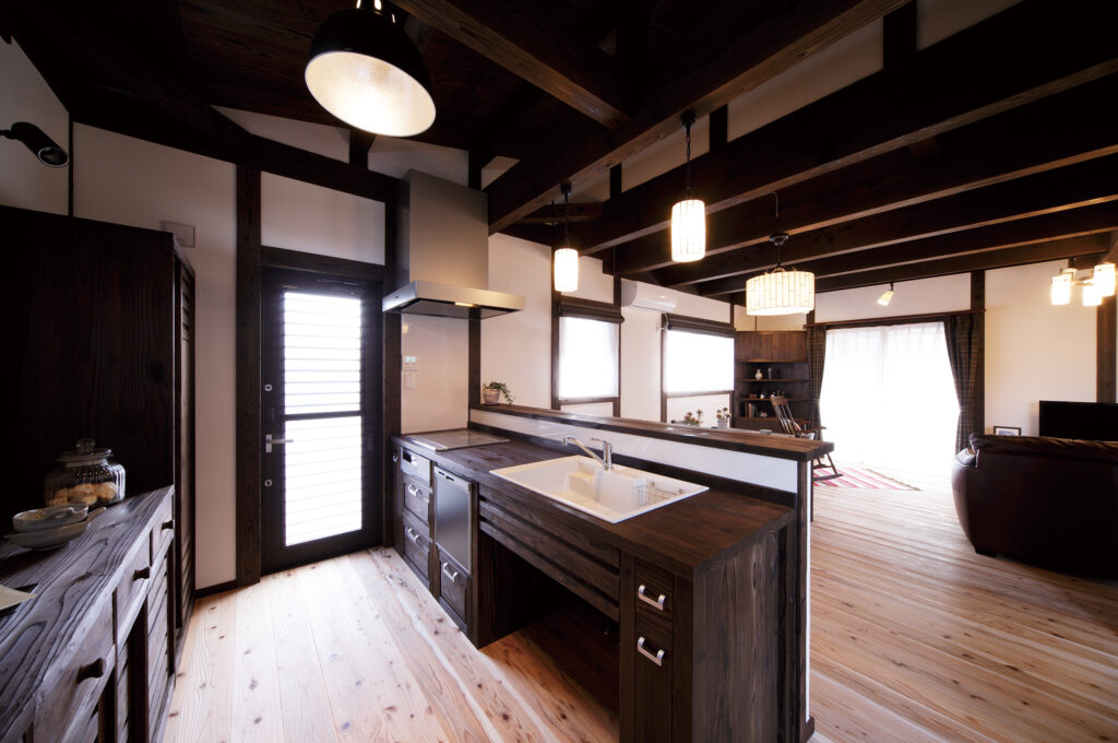 音響熟成木材「黒」を使った手づくりのオリジナルキッチンは、品のある存在感が印象的