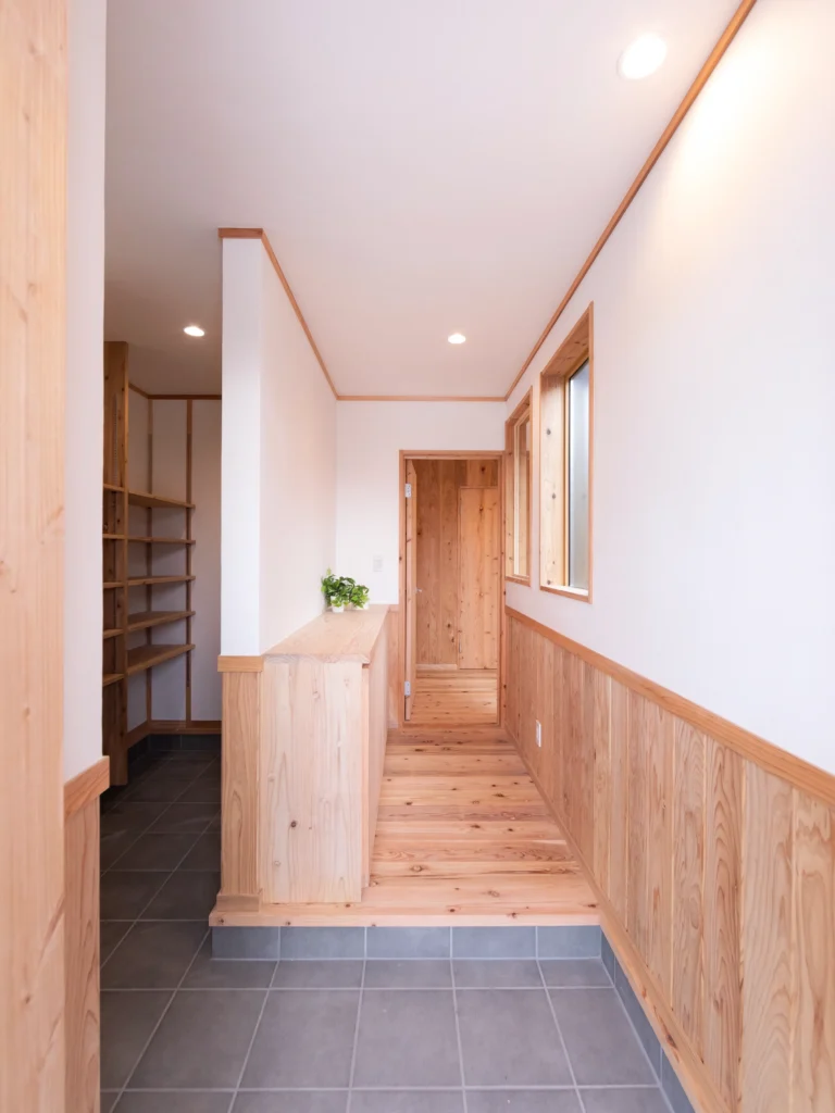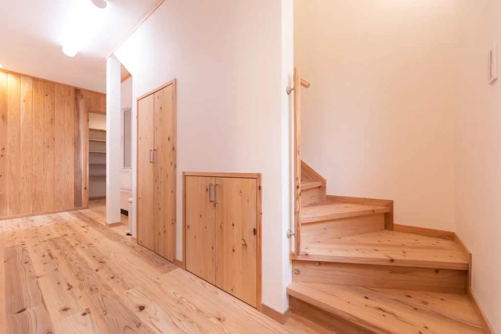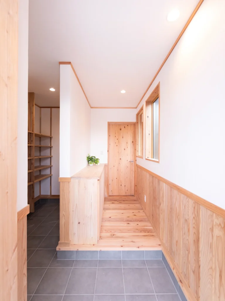 無垢・無塗装の木の香りがいっぱいに広がる玄関ホールは、漆喰壁と無垢材という自然素材が気持ちのいい雰囲気を生み出しています。