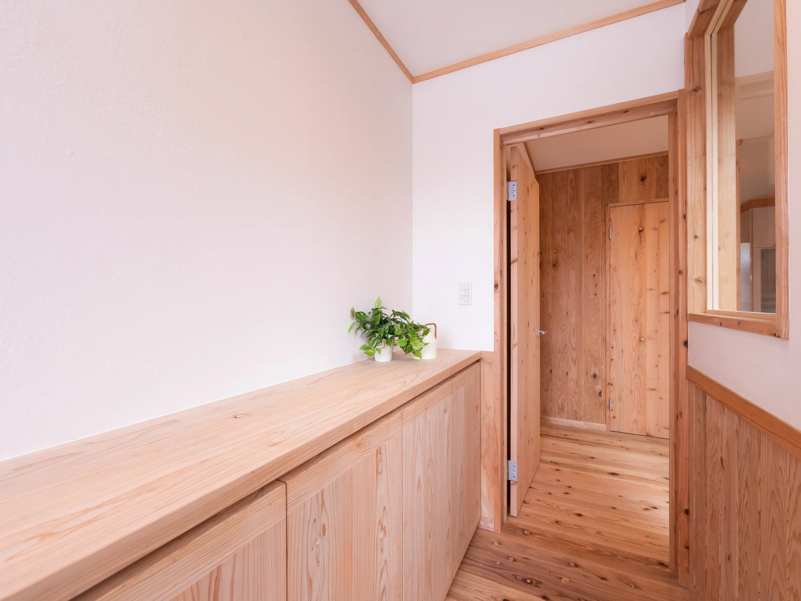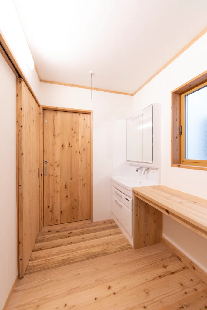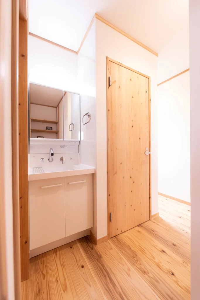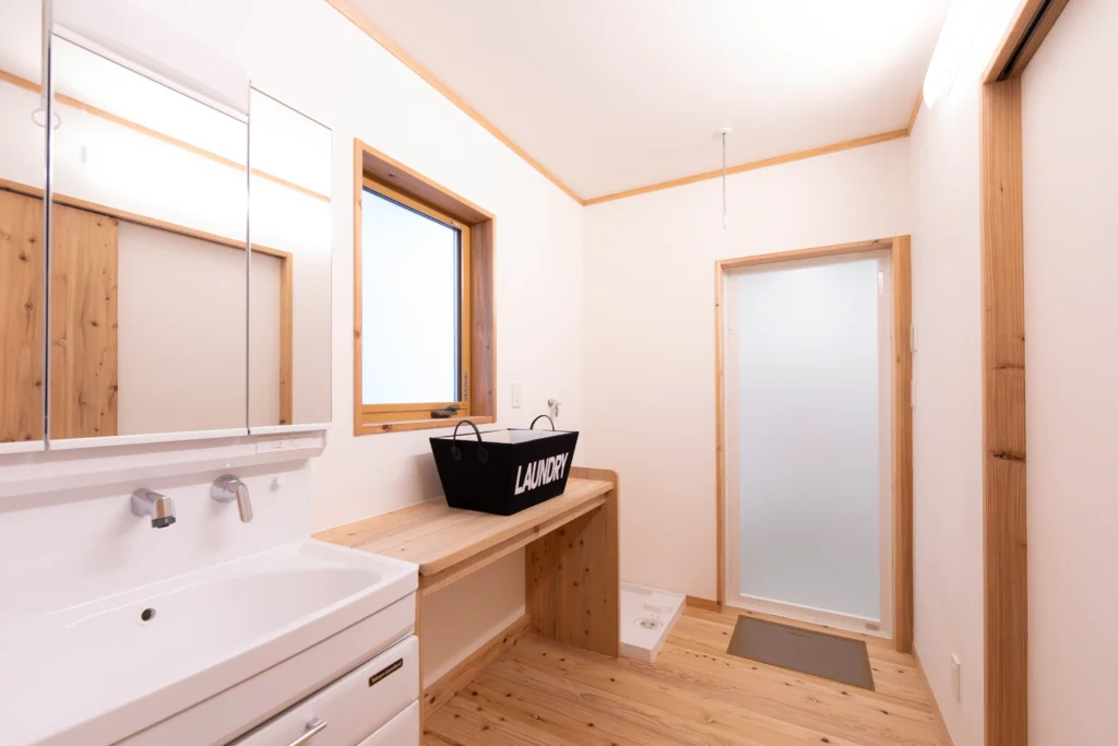 便利な造り付けのカウンターがある洗面スペースをはじめ、調湿作用のある自然素材の作用によって、水まわりも快適に仕上がっています。