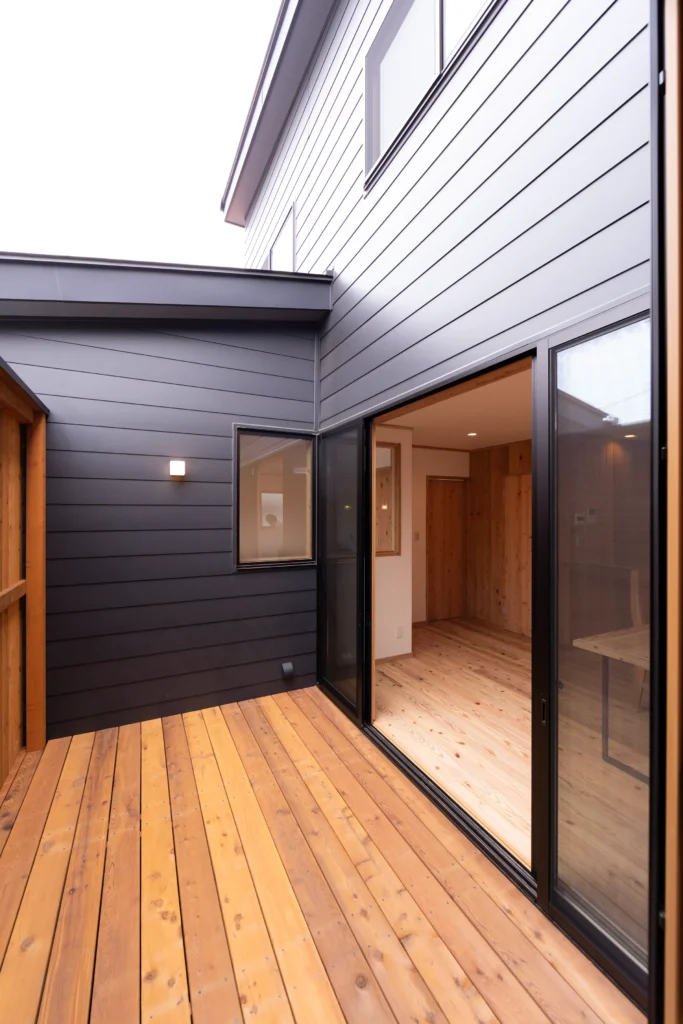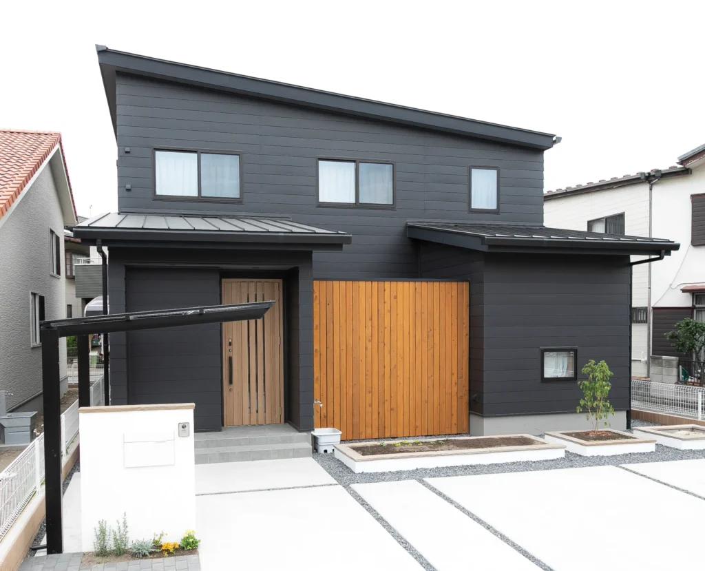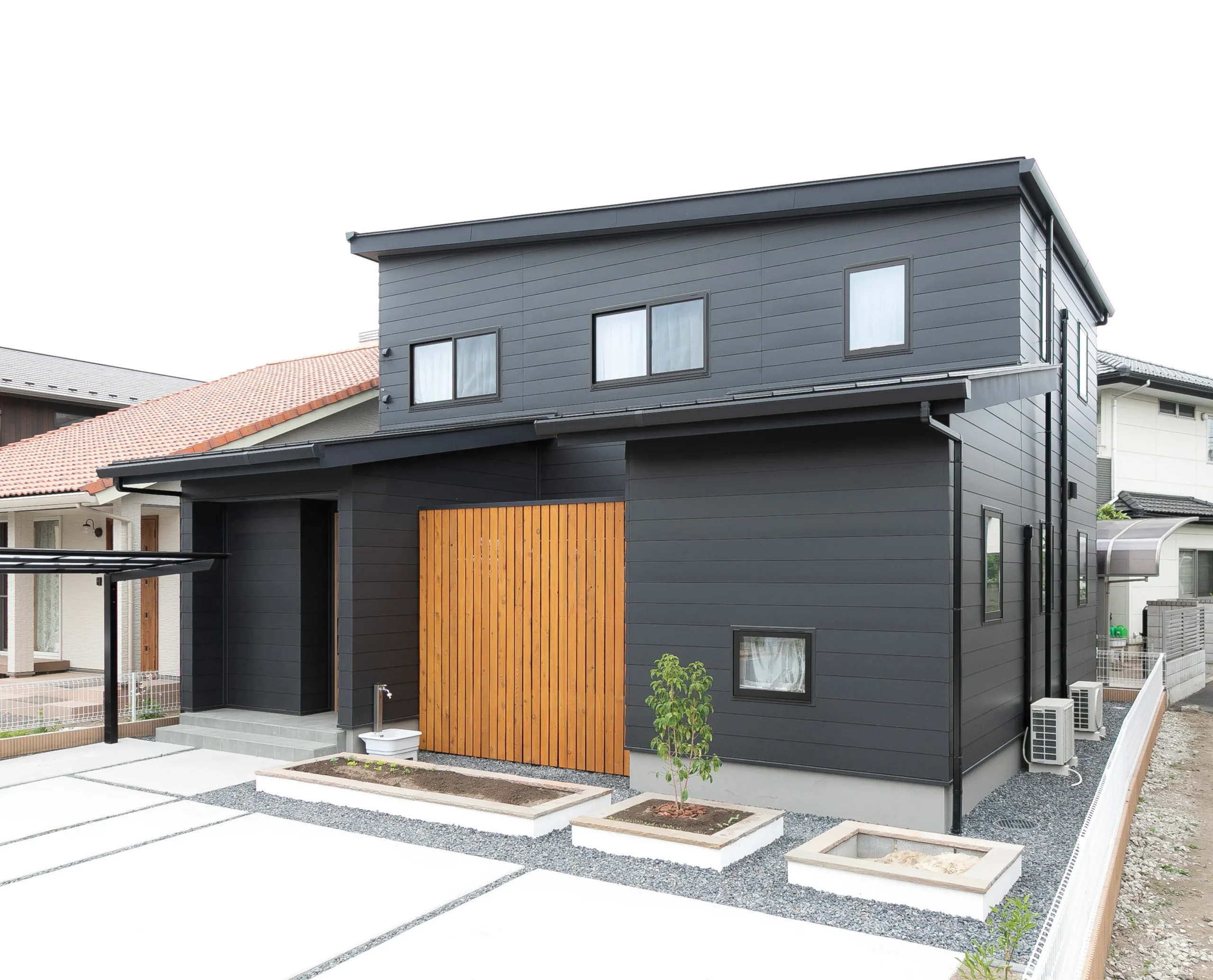 黒い外壁の中央に設けられた木製ルーバーが印象的なそのお住まいは、自然素材の豊かな生活世界が広がる、心地いいお住まいです。