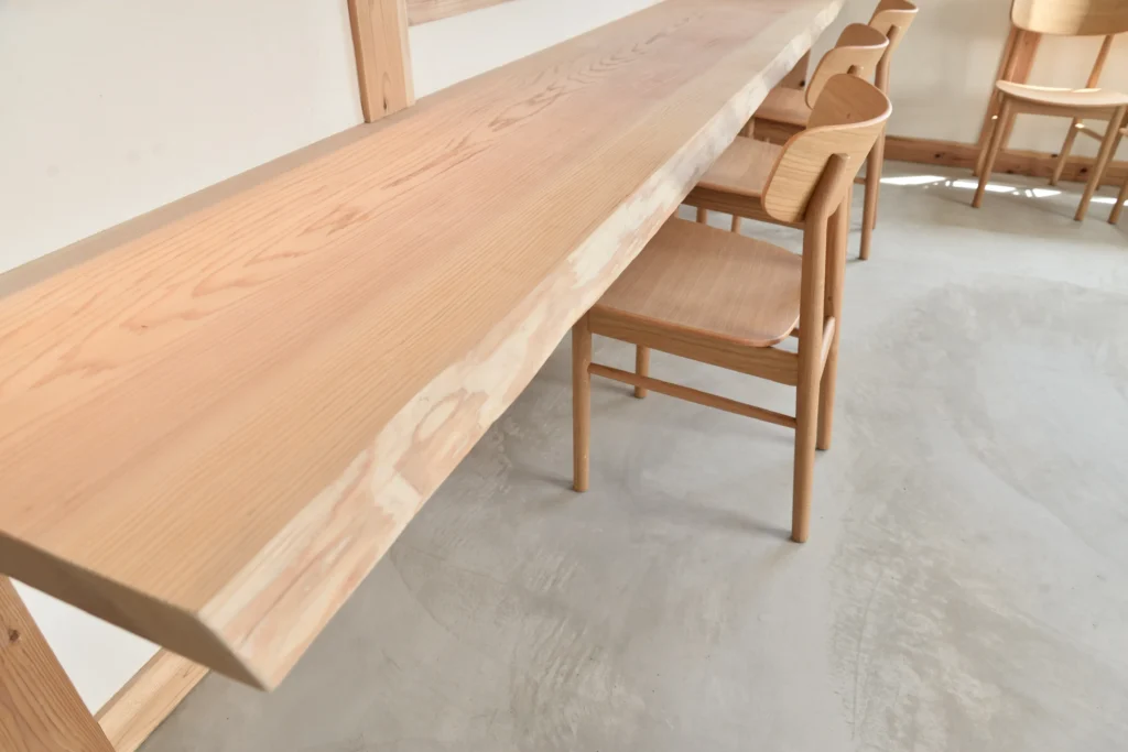無垢・無塗装のこだわりの木材「音響熟成木材」を使った一枚板のカウンター。