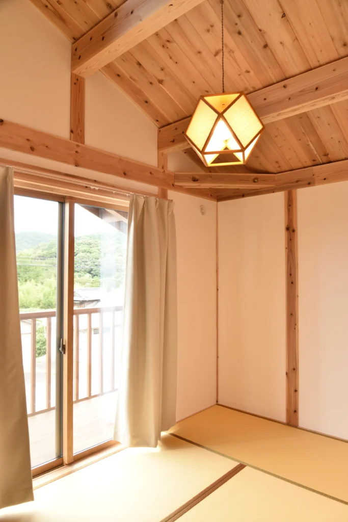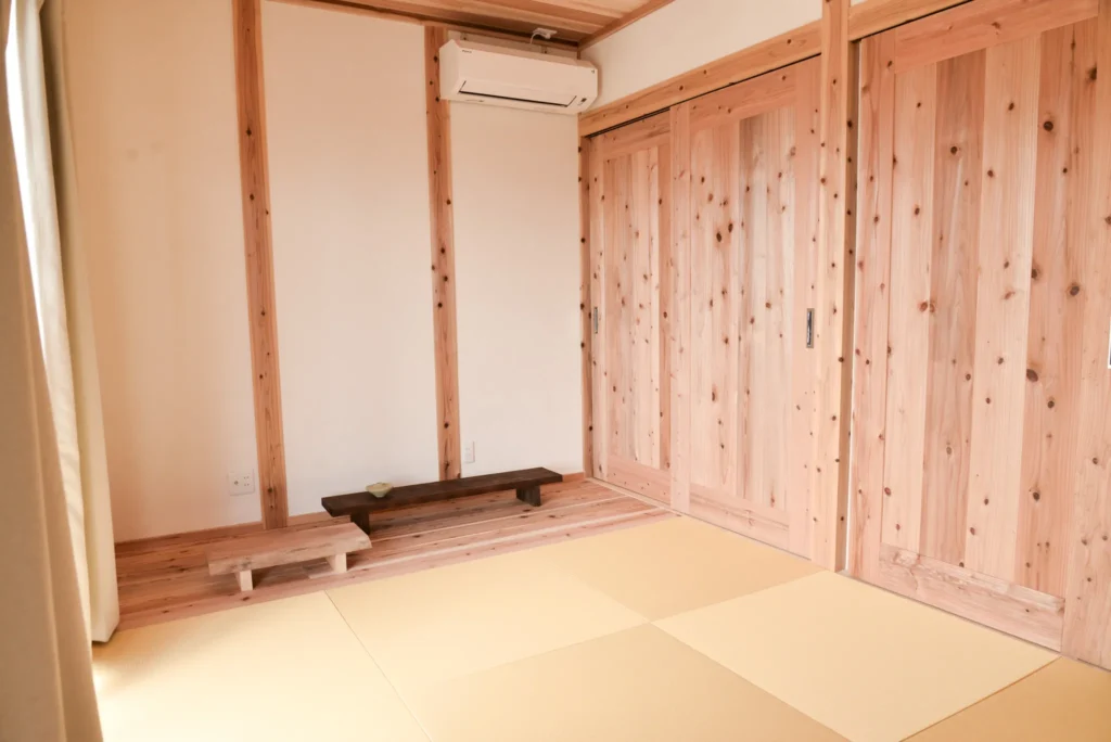 室内の空気を浄化する天然素材の幻の漆喰と無垢・無塗装の音響熟成木材に加え、い草のすがすがしい香りと消臭効果をあわせ持った竹炭入り清活畳が使われた和室。