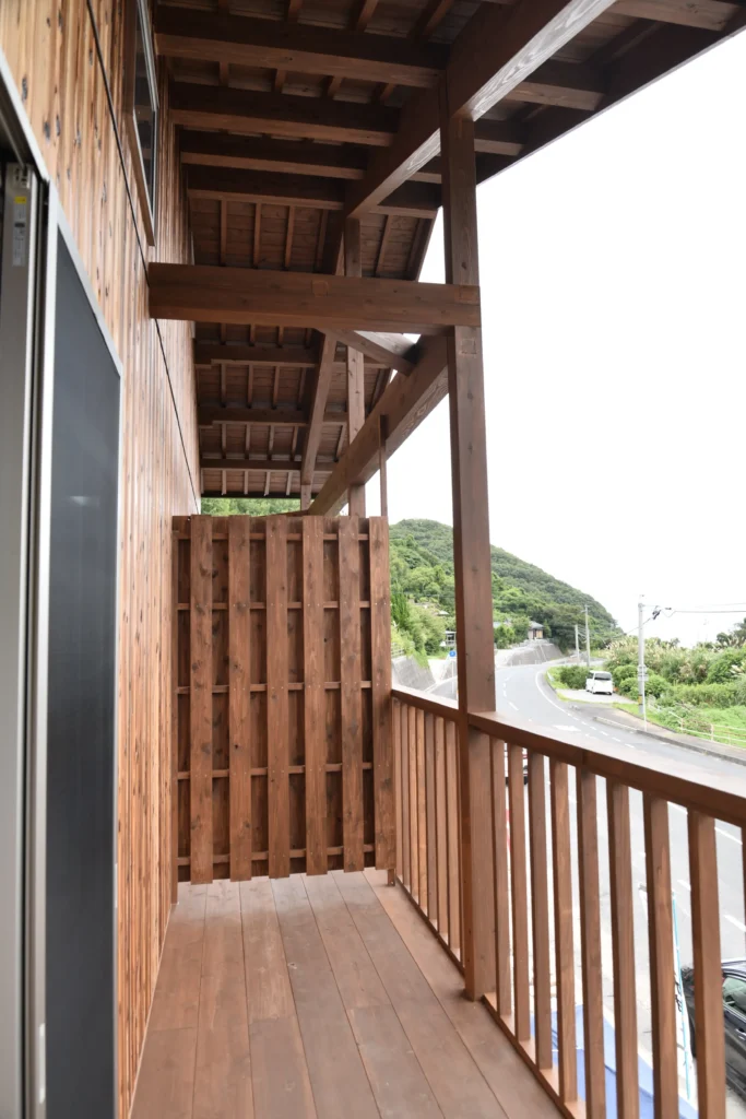 「小さな宿 いずい食堂」さんの外観は、2階正面と外壁まわりに使われた木材のナチュラルな質感が印象的です。