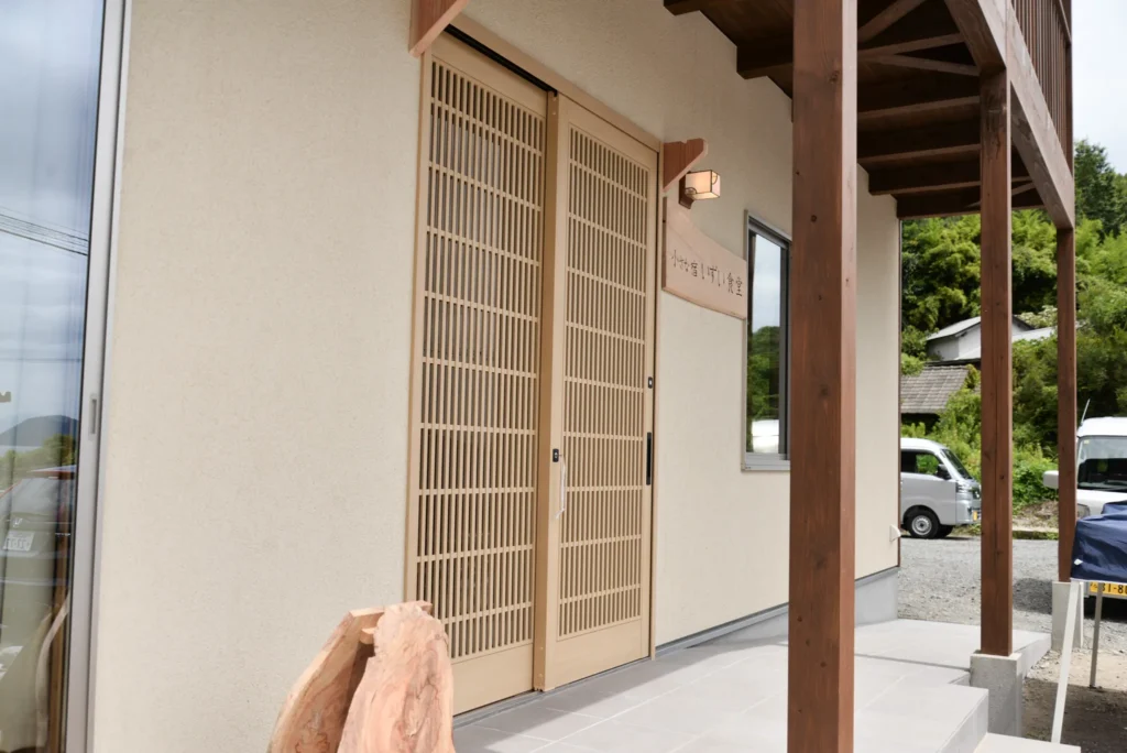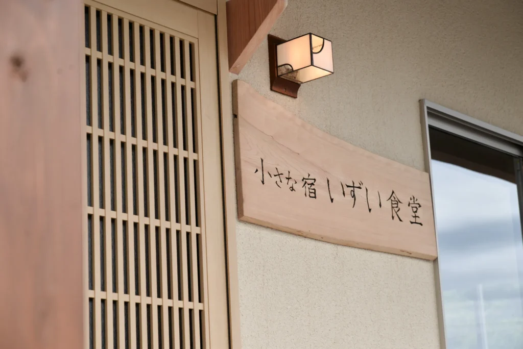 あえて木を使わず建物全体でツートンカラーになるようにデザインされた1階エントランスでは、いずい食堂のご主人自らが彫られた看板が迎えてくれます。